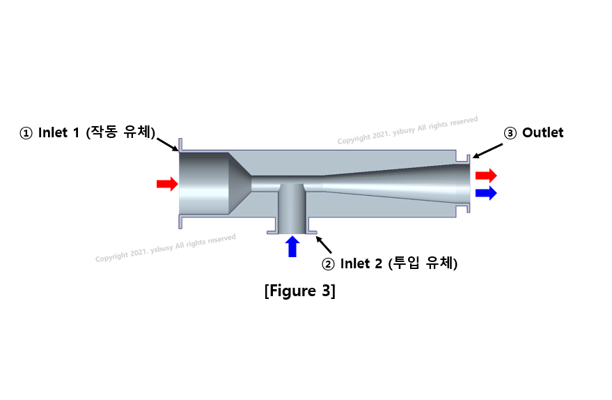 - 이젝터는 위 이미지와 같이 2개의 Inlet(공급부)와 1개의 Outlet(배출부)로 구성된다.